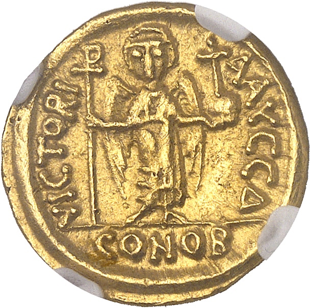 Rv. VICTORI - A AVCC (an) / CONOB. La Victoire, ailée, debout de face, tenant une croix chrismée et un globe crucigère.