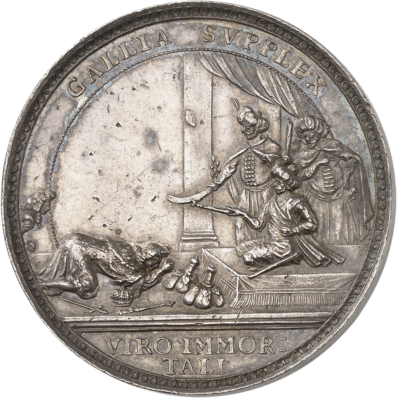 Av. GALLIA SVPPLEX. Le Roi Louis XIV agenouillé au sol, et son ambassadeur, avec ses insignes royales, livrant des sacs d’or au Dey d’Alger accompagné de deux conseillers, sur une estrade ; à l’exergue : VIRO IMMOR / TALI.