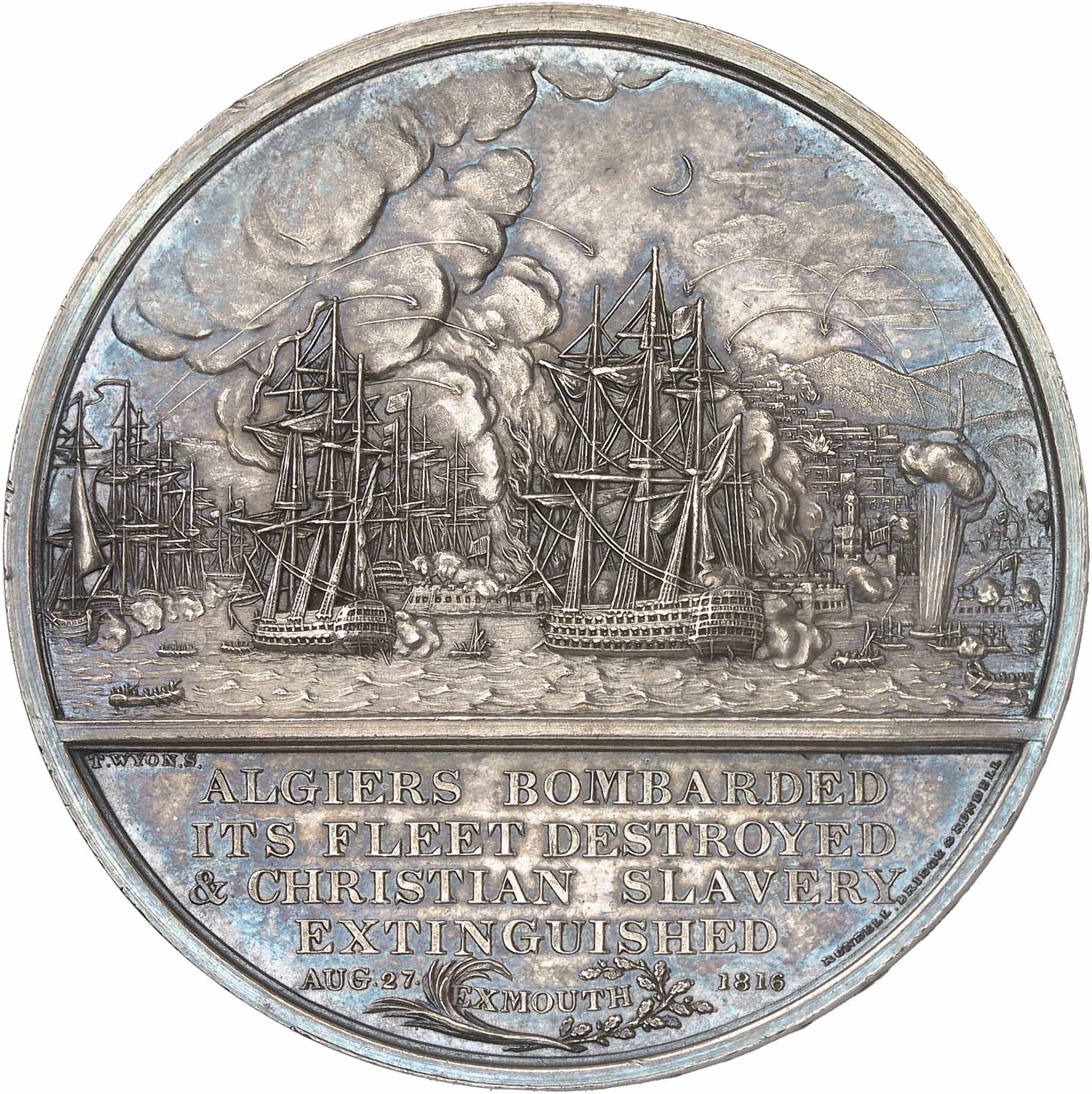 Rv. Vue panoramique des navires bombardant Alger ; signature T. WYON S. ; à l’exergue : ALGIERS BOMBARDED / ITS FLEET DESTROYED / & CHRISTIAN SLAVERY / EXTINGUISHED et au-dessous couronne formée d’une palme et d’une branche de chêne avec AUG 27 - 1816 et EXMOUTH.