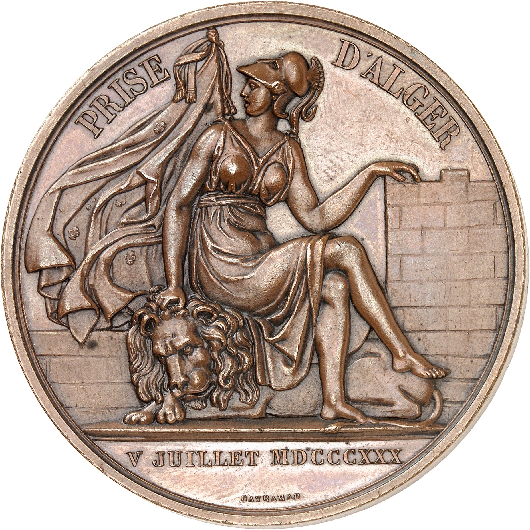 Rv. PRISE - D'ALGER. La France, casquée à l'ancienne, est assise sur un lion qu'elle maintient couchée de la main droite ; sa main gauche est appuyée sur une muraille crénelée. Derrière elle, un étendard fleurdelisé ; à l'exergue : V JUILLET MDCCCXXX et signature GAYRARD.