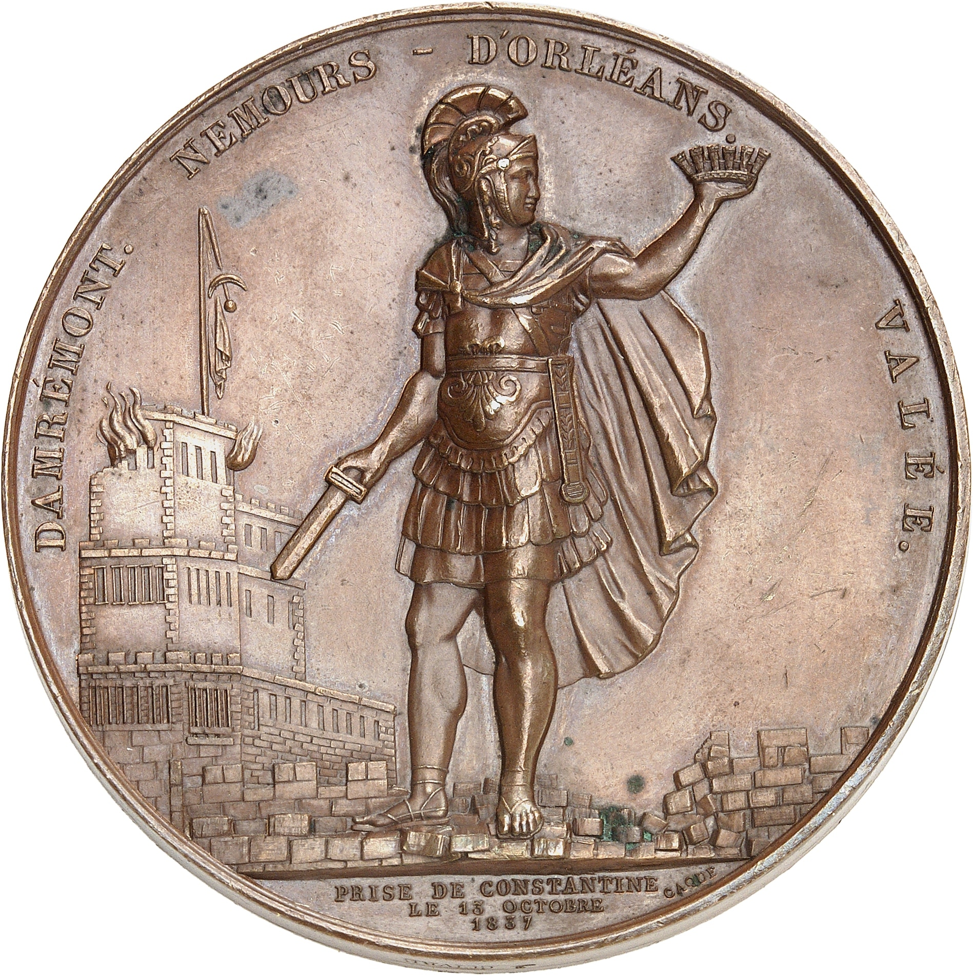 Rv. DAMRÉMONT. NEMOURS - D'ORLÉANS VALÉE. Un guerrier antique tenant un glaive d'une main et une couronne de l'autre se tient sur la brèche d'un rempart avec une tour en feu, surmontée d’un drapeau ; à l'exergue : PRISE DE CONSTANTINE/ LE 13 OCTOBRE/ 1837 et signature CAQUÉ.