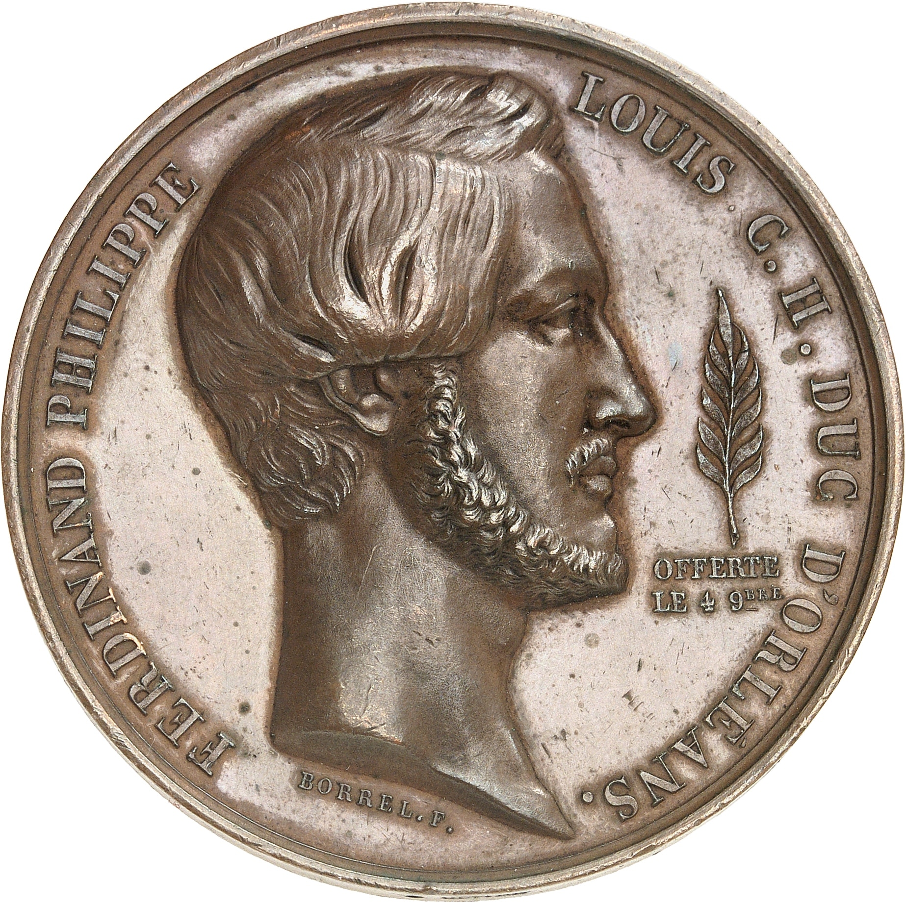 Av. FERDINAND PHILIPPE - LOUIS C. H. DUC D'ORLÉANS. Buste tête nue du duc d'Orléans à droite, à droite une palme et l'inscription OFFERTE/ LE 4 9bre ; au-dessous, signature BORREL. F.