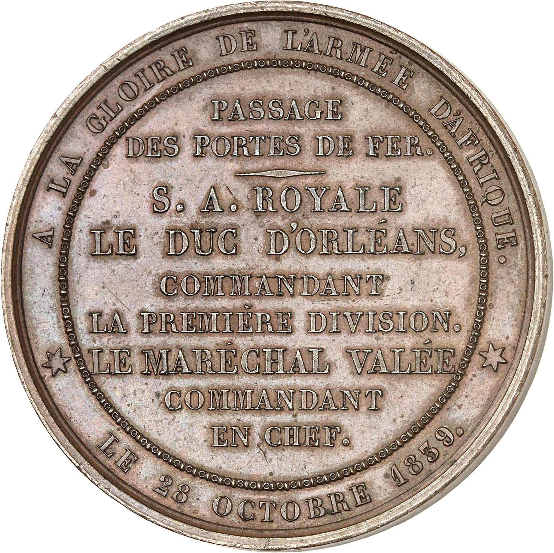 Rv. * A LA GLOIRE DE L'ARMÉE D'AFRIQUE *// LE 28 OCTOBRE 1839. Inscription en neuf lignes : PASSAGE/ DES PORTES DE FER./ S. A. ROYALE/ LE DUC D'ORLÉANS,/ COMMANDANT/ LA PREMIÈRE DIVISION./ LE MARÉCHAL VALÉE/ COMMANDANT/ EN CHEF.