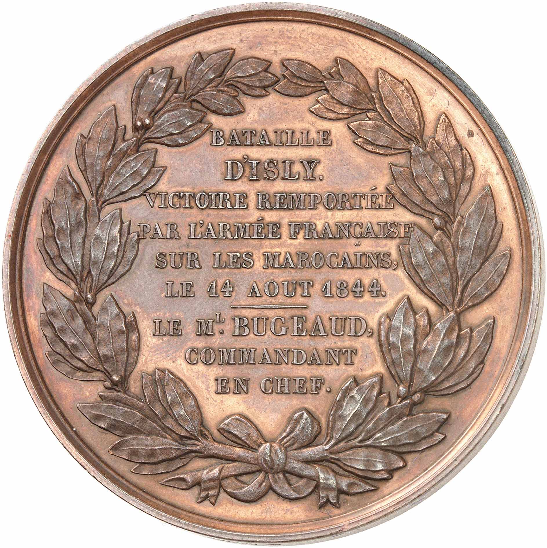 Rv. Couronne formée de deux branches de laurier. Au centre, inscription en neuf lignes : BATAILLE/ D'ISLY/ VICTOIRE REMPORTÉE/ PAR L'ARMÉE FRANÇAISE/ SUR LES MAROCAINS/ LE 14 AOÛT 1844/ LE Ml BUGEAUD,/ COMMANDANT/ EN CHEF.