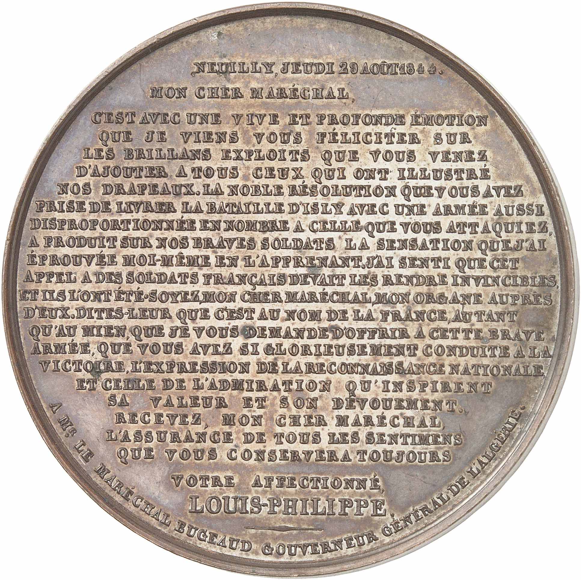Rv. A Mr LE MARECHAL BUGEAUD GOUVERNEUR GÉNÉRAL DE L'ALGÉRIE. Inscriptions en 24 lignes : NEUILLY, JEUDI 29 AOÛT 1844./ MON CHER MARÉCHAL, C'EST AVEC UNE VIVE ET PROFONDE ÉMOTION/ QUE JE VIENS VOUS FELICITER (etc.) VOTRE AFFECTIONNÉ/ LOUIS-PHILIPPE.
