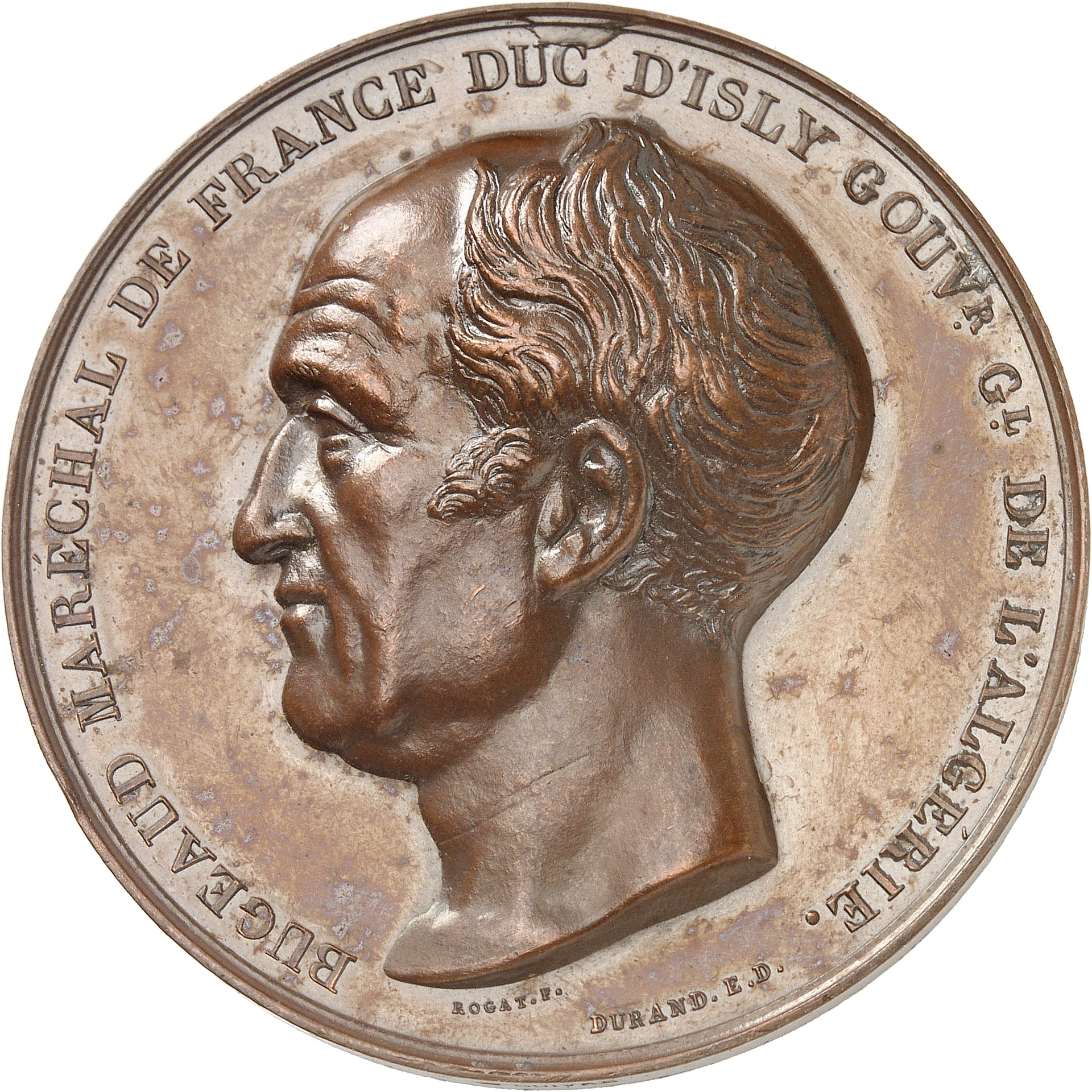 Av. BUGEAUD MARÉCHAL DE FRANCE DUC D'ISLY GOUVr Gl DE L'ALGÉRIE. Tête de Bugeaud à gauche ; au-dessous, signatures ROGAT. F. et DURAND. E. D.