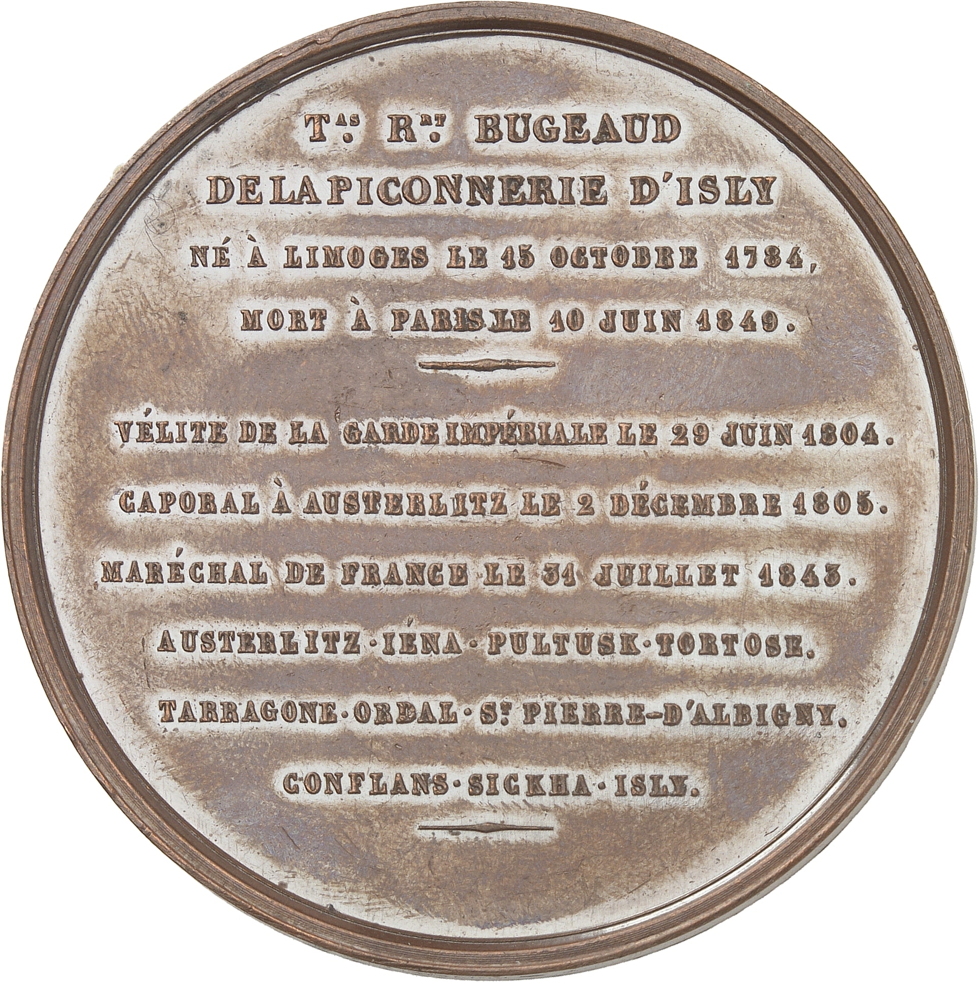 Rv. Inscriptions en dix lignes : Tas Rrt BUGEAUD/ DE LA PICONNERIE D'ISLY/ NÉ À LIMOGES LE 15 OCTOBRE 1784,/ MORT À PARIS LE 10 JUIN 1849./ VÉLITE DE LA GARDE IMPÉRIALE LE 29 JUIN 1804./ CAPORAL À AUSTERLITZ LE 2 DÉCEMBRE 1805./ MARÉCHAL DE FRANCE LE 31 JUILLET 1843./ AUSTERLITZ. IÉNA. PULTUSK. TORTOSE./ TARRAGONE. ORDAL. St-PIERRE D'ALBIGNY./ CONFLANS. SICKHA. ISLY.