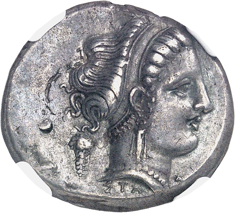 Av. Tête de Parthénope à droite, avec collier de perles et boucles d’oreilles, une grappe de raisin derrière, légende ΣTΑ dessous et monogramme XA devant.