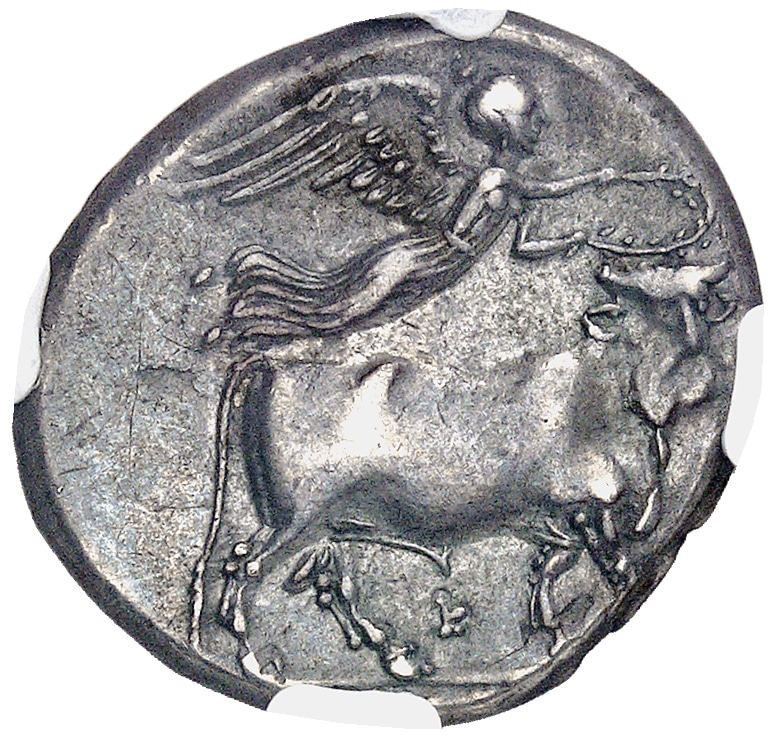 Rv. [NEOPOΛITON]. Taureau androcéphale marchant à droite, couronné par une victoire ; au-dessous K.