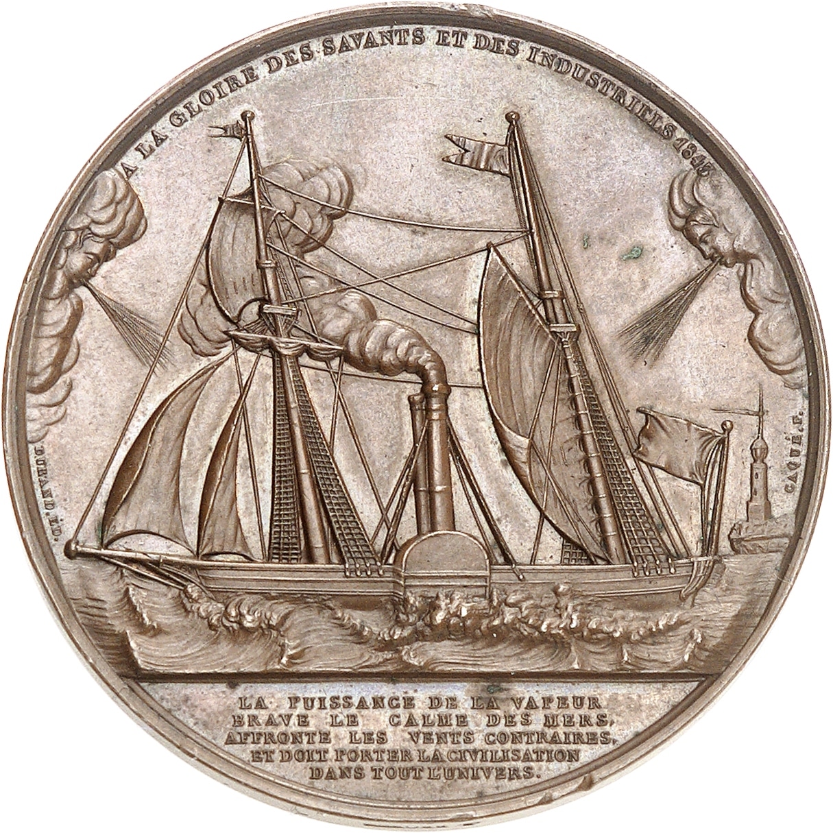 Av. A LA GLOIRE DES SAVANTS ET DES INDUSTRIELS 1843. Un steamer voguant à gauche, entre les vents contraires sortant des nuages ; signature CAQUÉ F ; à l’exergue : LA PUISSANCE DE LA VAPEUR / BRAVE LE CALME DES MERS / AFFRONTE LES VENTS CONTRAIRES / ET DOIT PORTER LA CIVILISATION / DANS TOUT L’UNIVERS.