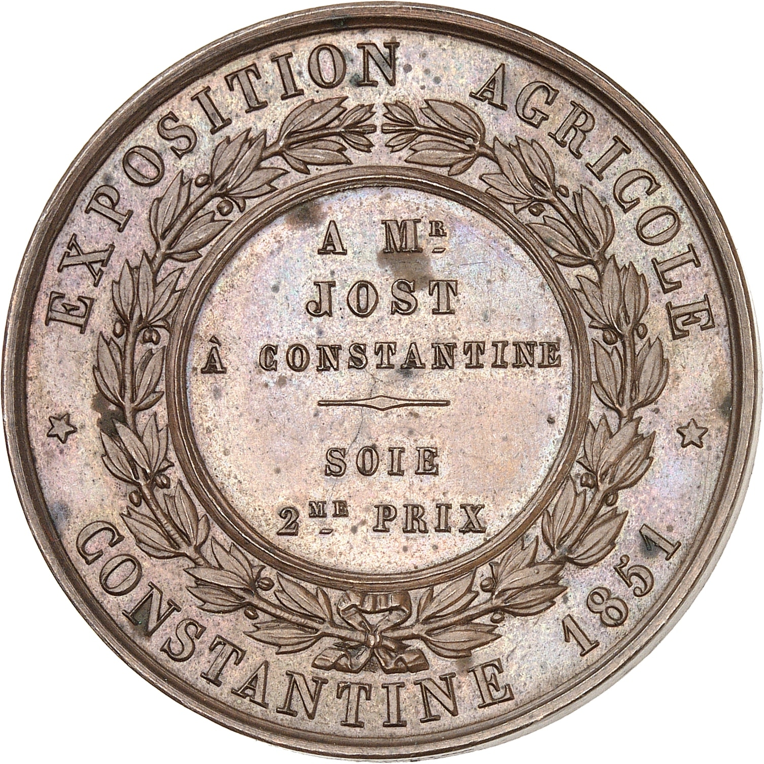 Rv. EXPOSITION AGRICOLE / CONSTANTINE 1851. Dans une couronne formée de deux branches de laurier, attribution : A MR / JOST / À CONSTANTINE / SOIE / 2ME PRIX.