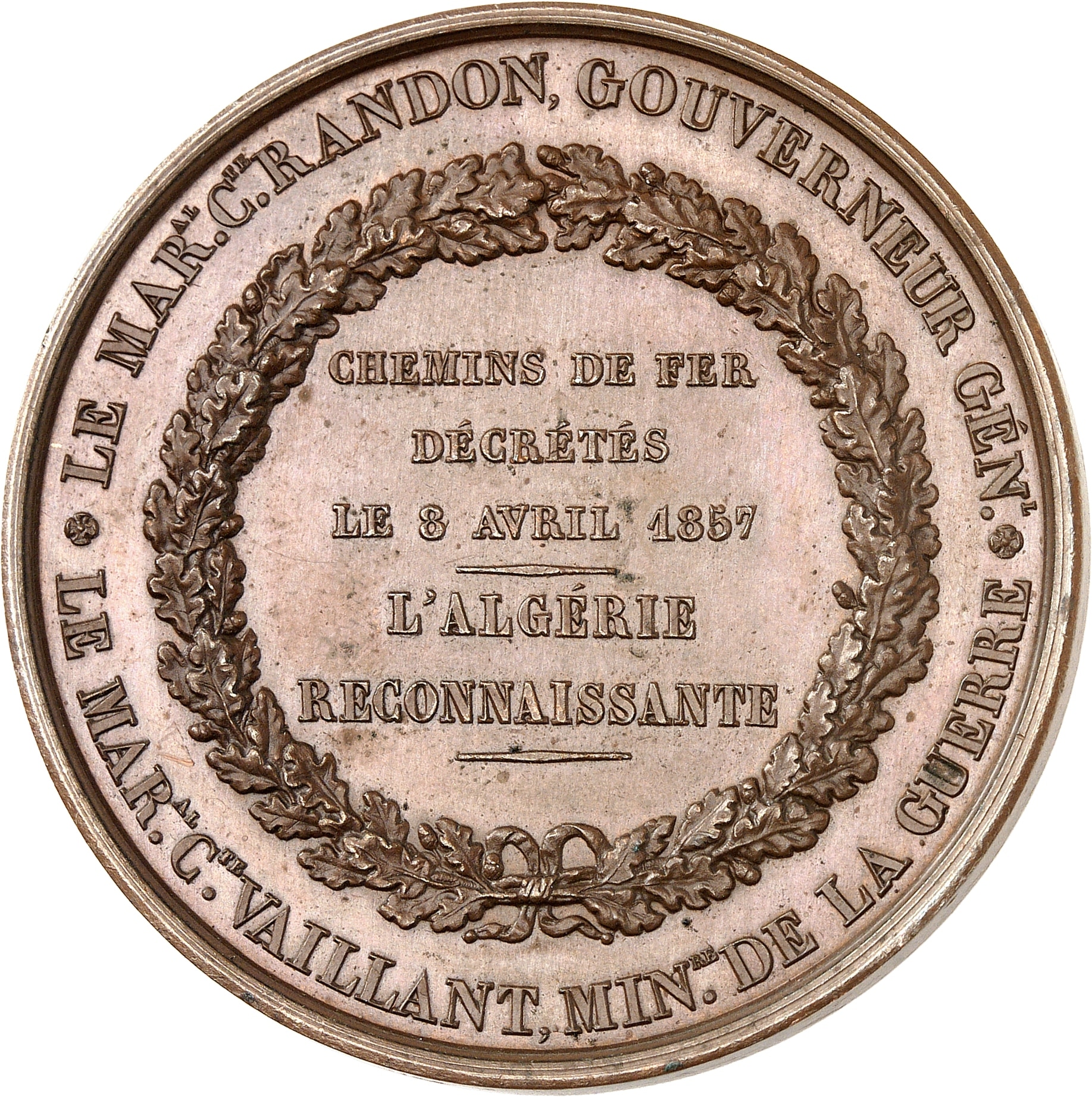 Rv. LE Mal Cte RANDON GOUVERNEUR GENl / LE MARal Cte VAILLANT, MINre DE LA GUERRE. Couronne de chêne, au centre : CHEMINS DE FER/ DÉCRÉTÉS/ LE 8 AVRIL 1857/ L'ALGÉRIE/ RECONNAISSANTE.