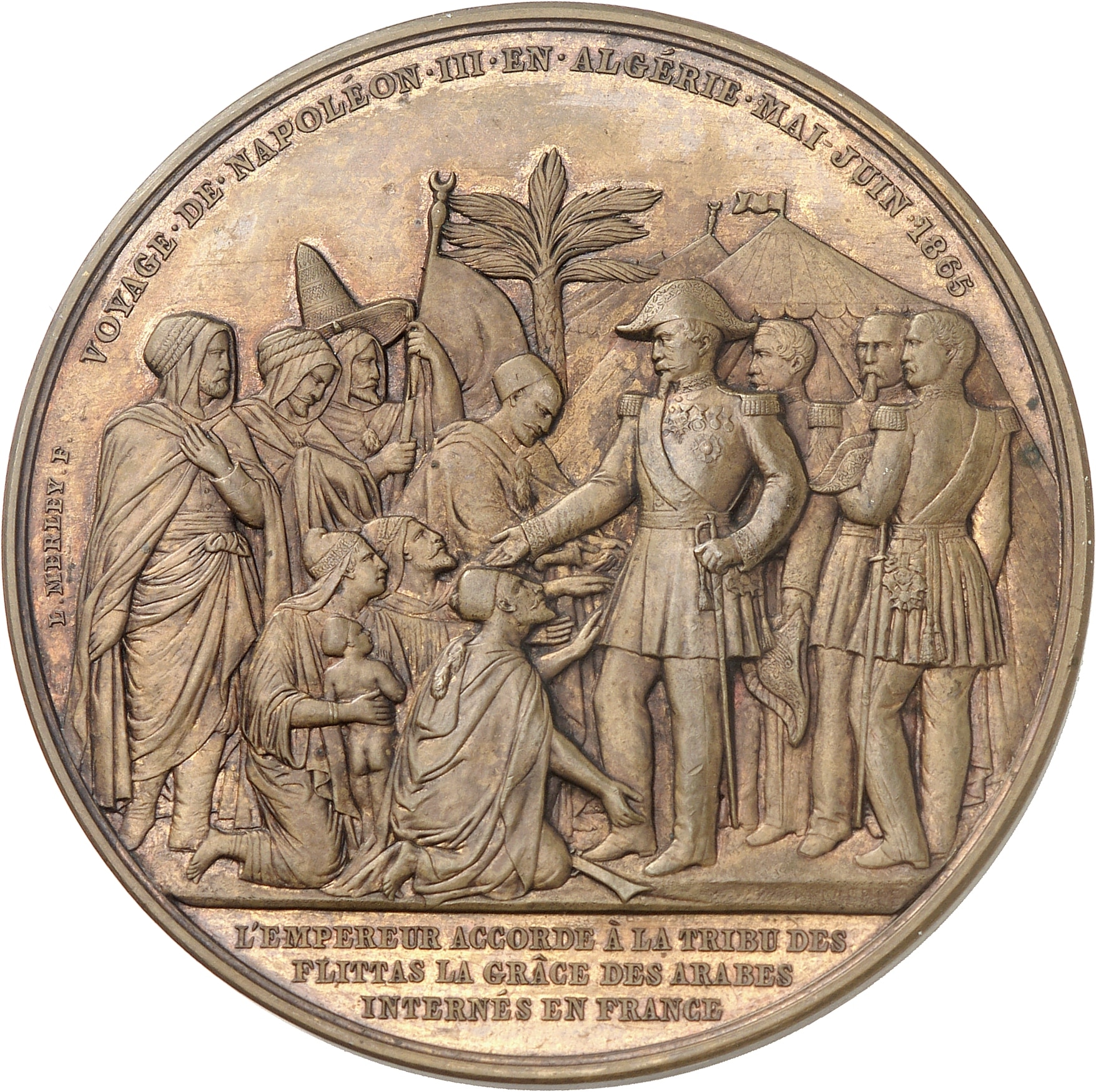 Rv. VOYAGE. DE. NAPOLEON. III. EN. ALGERIE. MAI-JUIN. 1865. Devant les tentes d'un camp français, l'Empereur à gauche, accompagné de trois officiers, reçoit un groupe d'indigènes venus réclamer sa clémence. Signature L. MERLEY. F. À l'exergue : L'EMPEREUR ACCORDE A LA TRIBU DES FLITTAS LA GRÂCE DES ARABES INTERNÉS EN FRANCE.