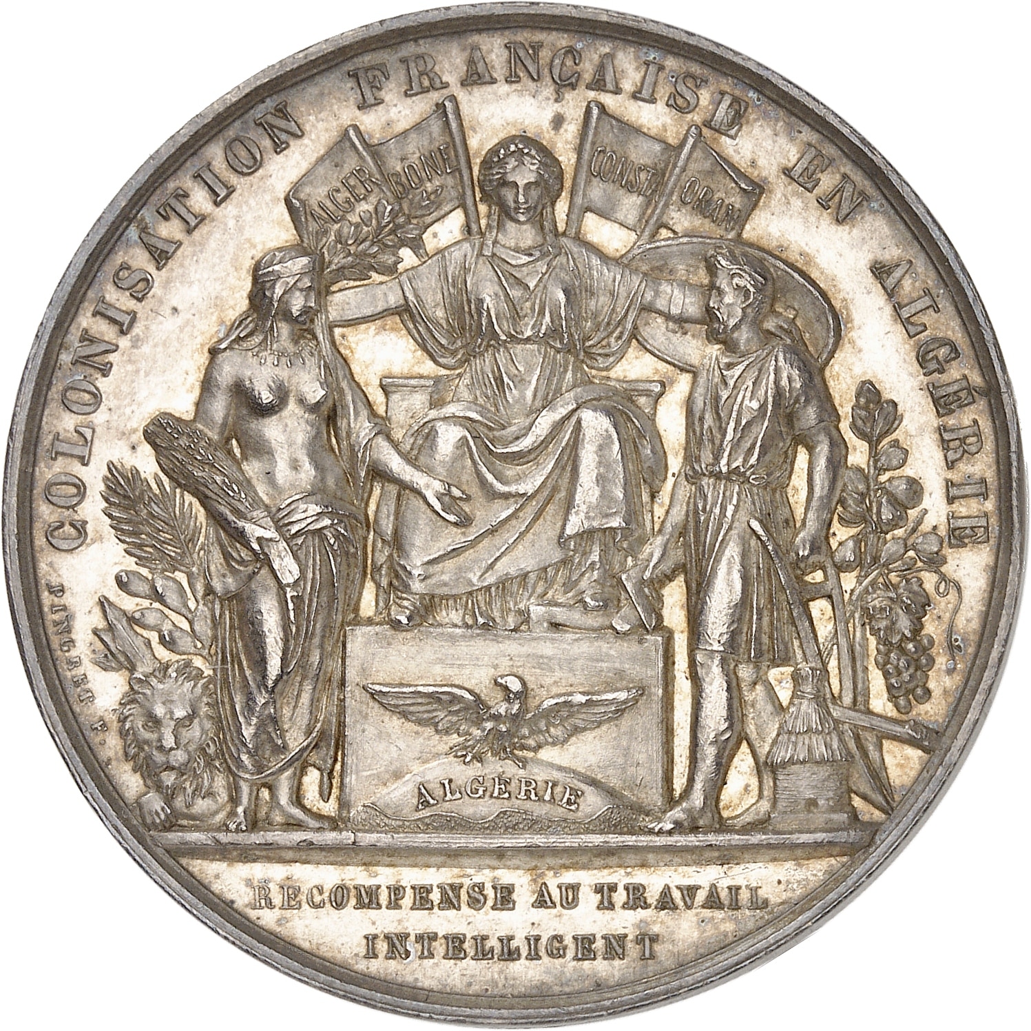 Av. COLONISATION FRANÇAISE EN ALGÉRIE. La France assise de face sur un autel réunissant un colon et un indigène, signature PINGRET ; à l'exergue : RECOMPENSE AU TRAVAIL/ INTELLIGENT.
