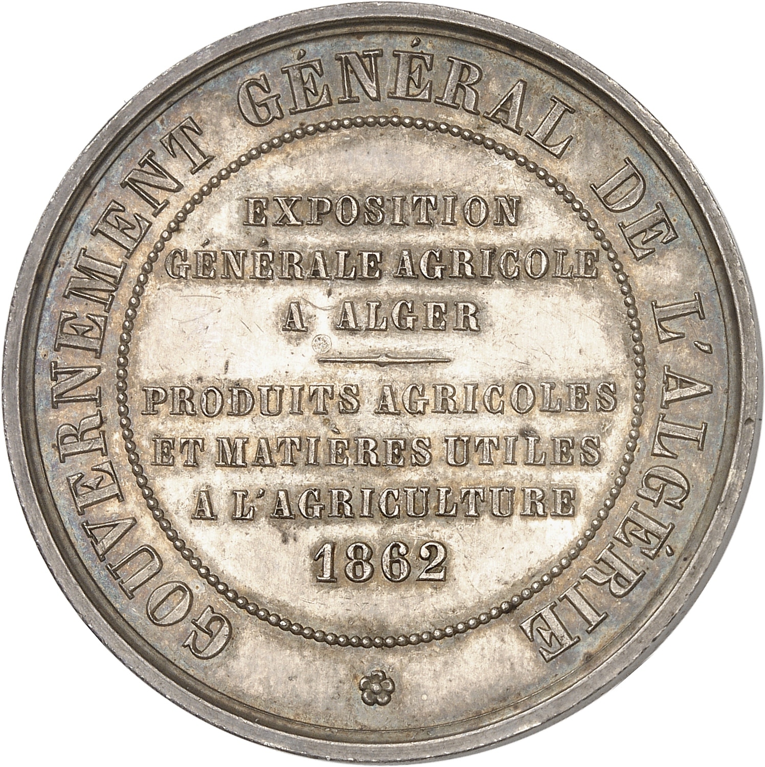 Rv. GOUVERNEMENT GÉNÉRAL DE L’ALGÉRIE. Au centre, attribution : EXPOSITION / GÉNÉRALE AGRICOLE / A ALGER / PRODUITS AGRICOLES / ET MATIÈRES UTILES / A L’AGRICULTURE / (date).