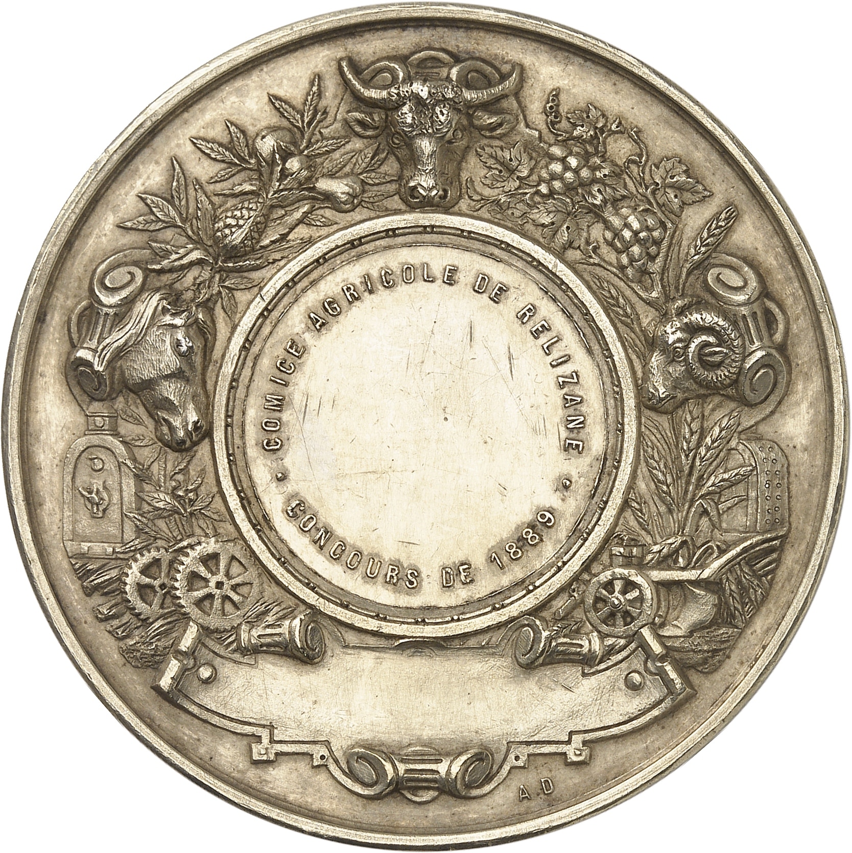 Rv. COMICE AGRICOLE DE RELIZANE / CONCOURS DE 1889. Frise composée d’outils agricoles et de différents animaux, avec un cartouche au-dessous.