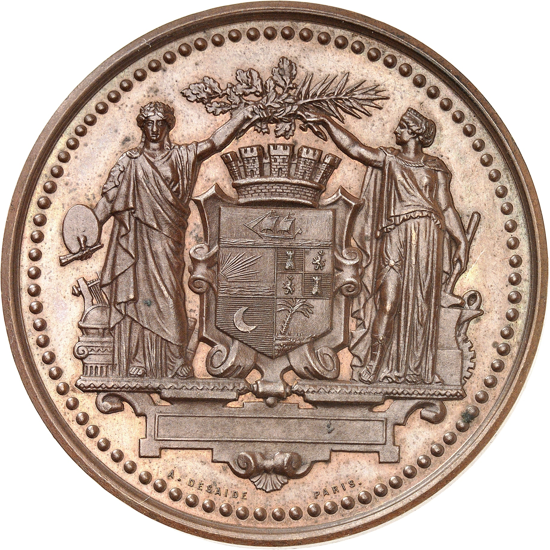 Av. Sur une plinthe, deux allégories des Arts et de l’Industrie tiennent une couronne au-dessus de l’écu crénelé de la ville ; signature A. DESAIDE PARIS.