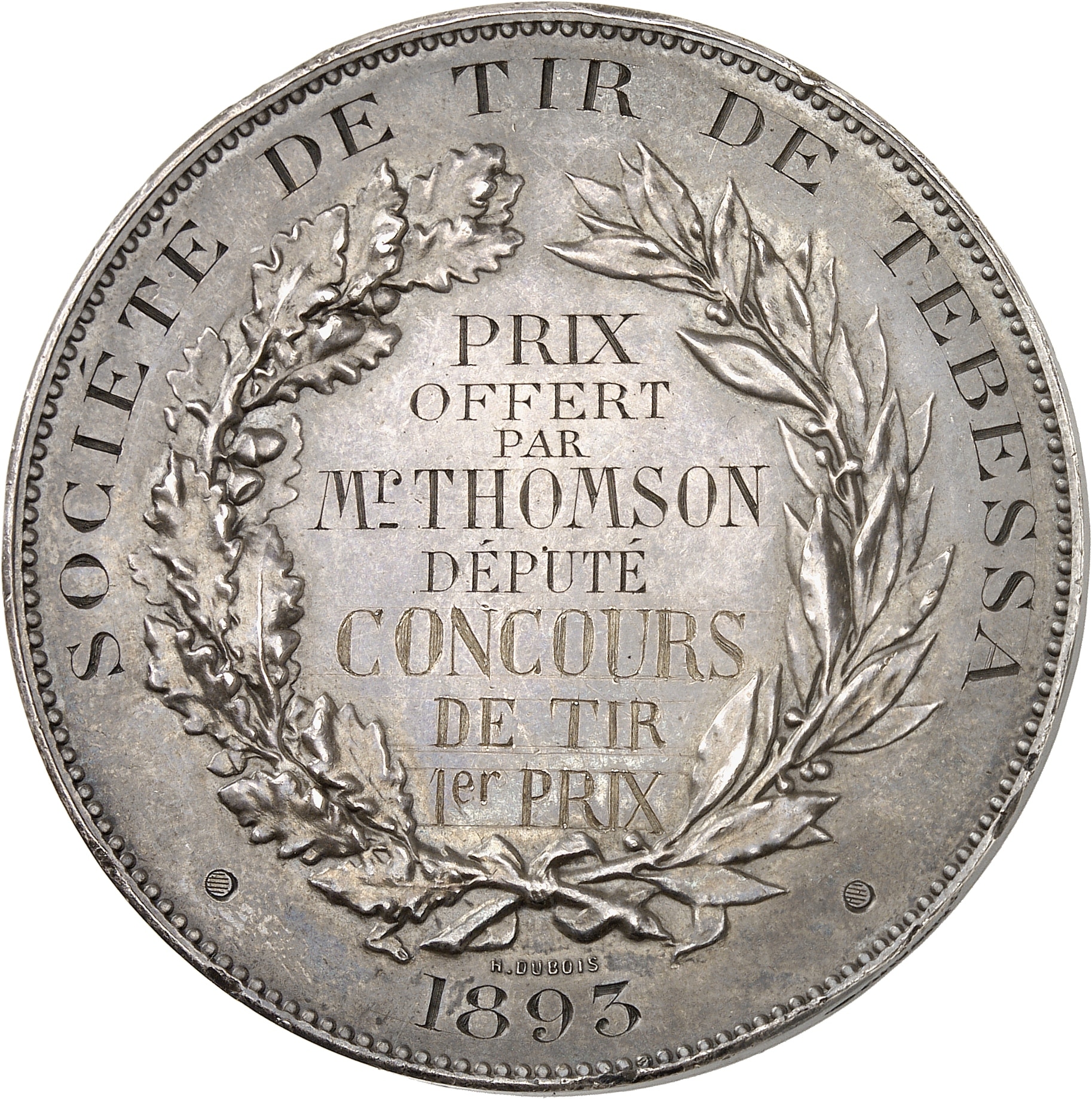 Rv. SOCIÉTÉ DE TIR DE TEBESSA / (date). Dans une couronne de chêne et de laurier ; au-dessous signature H. DUBOIS. Attribution gravée en huit lignes : PRIX/ OFFERT/ PAR/ Mr THOMSON/ DÉPUTÉ/ CONCOURS/ DE TIR/ 1er PRIX.