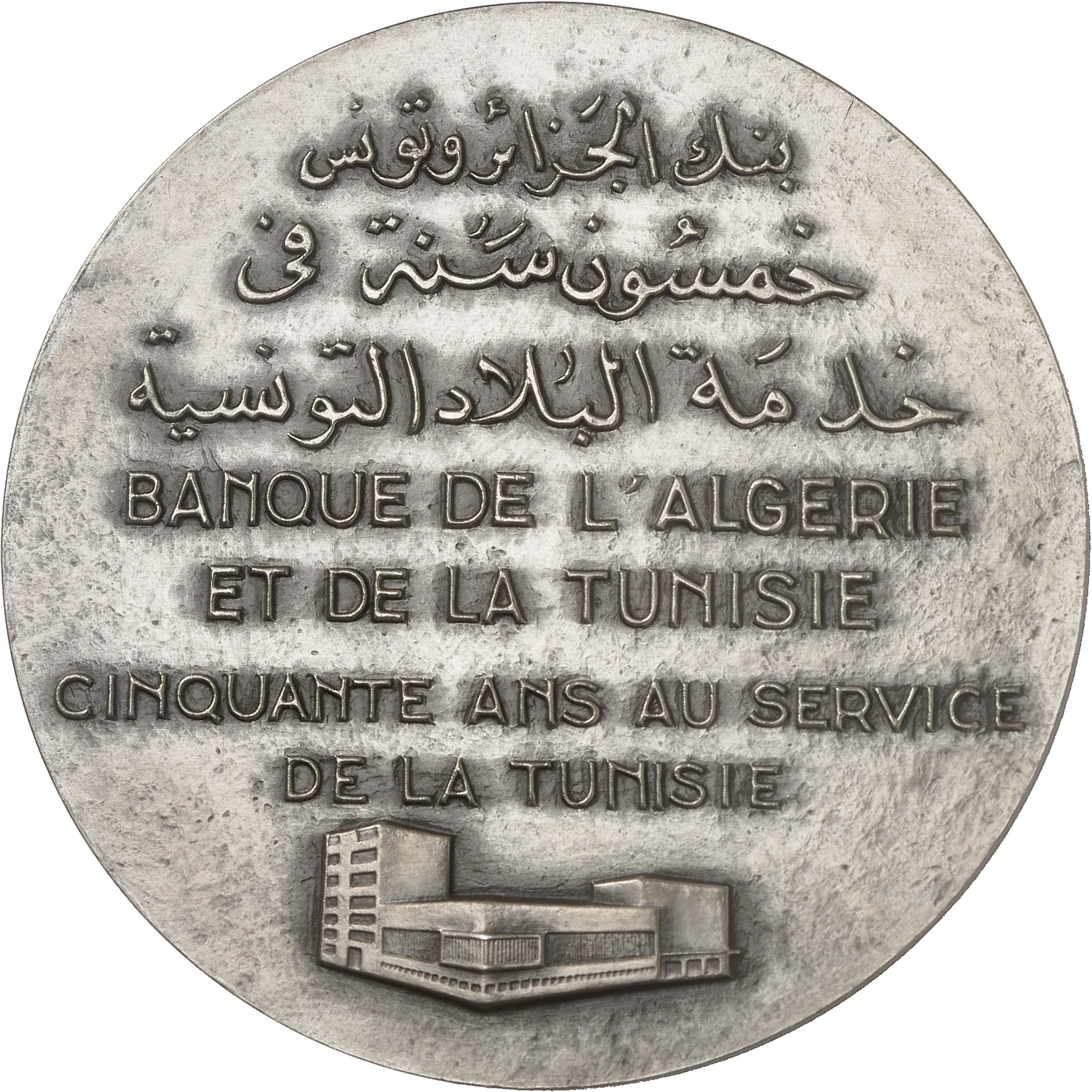 Rv. Vue d'une banque, au-dessus : BANQUE DE L'ALGERIE/ ET DE LA TUNISIE/ CINQUANTE ANS AU SERVICE/ DE LA TUNISIE.