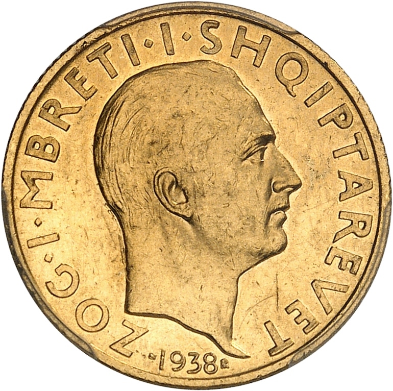 - ALBANIA Zog Ier (1/9/1928-1939). 20 franga ari, 10e anniversaire du règne 1938, R, Rome.