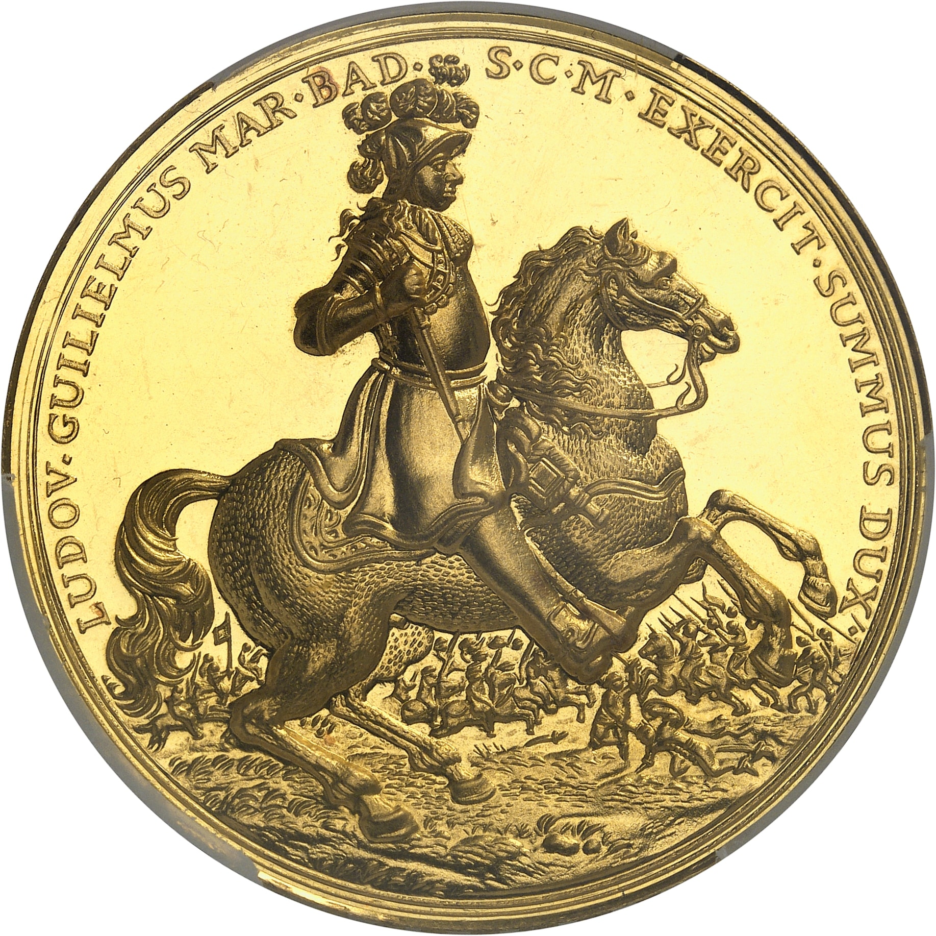 Av. LUDOV. GUILIELMUS MAR. BAD. - S. C. M. EXERCIT. SUMMUS DUX. Au-dessus d'une scène de bataille contre les turcs, Louis-Guillaume de Bade-Bade (Türkenlouis) en armure chevauchant à droite.