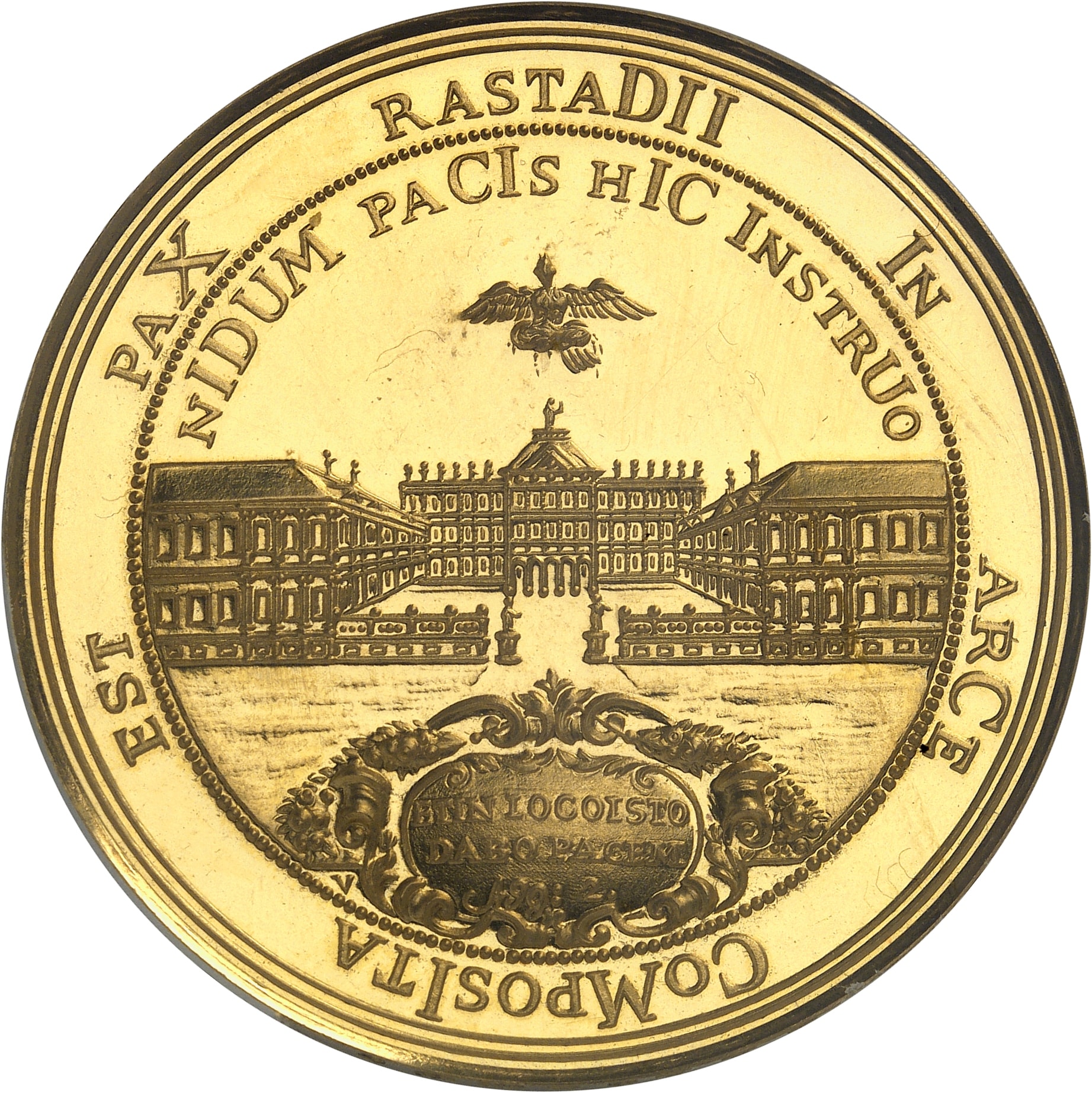 Rv. RASTADII IN ARCE COMPOSITA EST PAX/ NIDUM PACIS HIC INSTRUO. Sous une colombe, vue du palais de Rastatt ; en-dessous écu inscrit ETIN LOCOISTO/ DABO PACEM/ A99: 2.