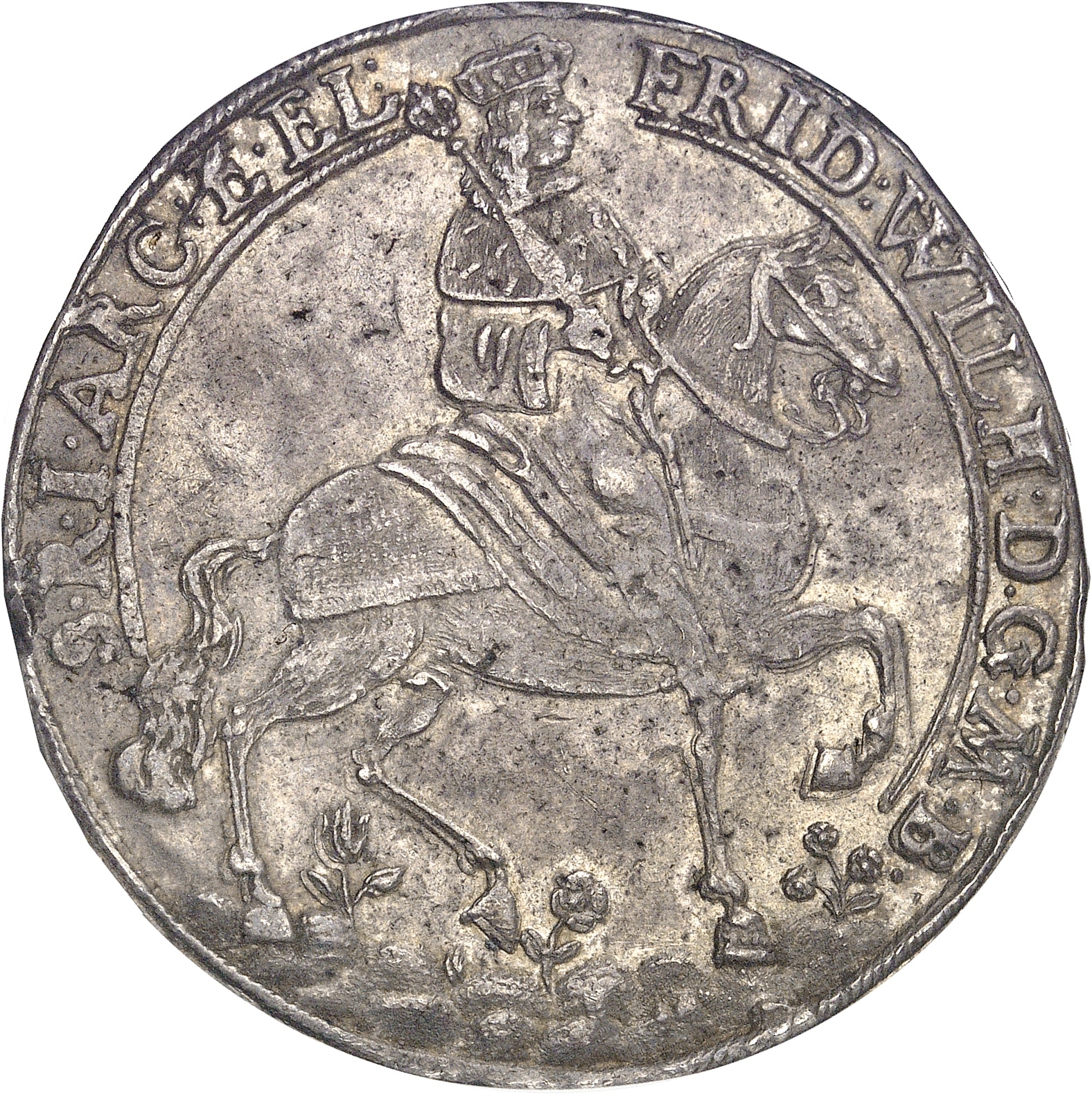 Av. FRID: WILH: D. G. M. B. S. R. I. ARC. E. EL. L’Électeur couronné, avec sceptre, à cheval à droite.