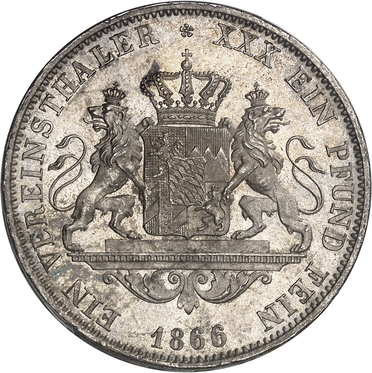 Rv. EIN VEREINSTHALER * XXX EIN PFUND FEIN. Sur un entablement, écu de Bavière couronné et soutenu par deux lions couronnés ; à l’exergue, (date).