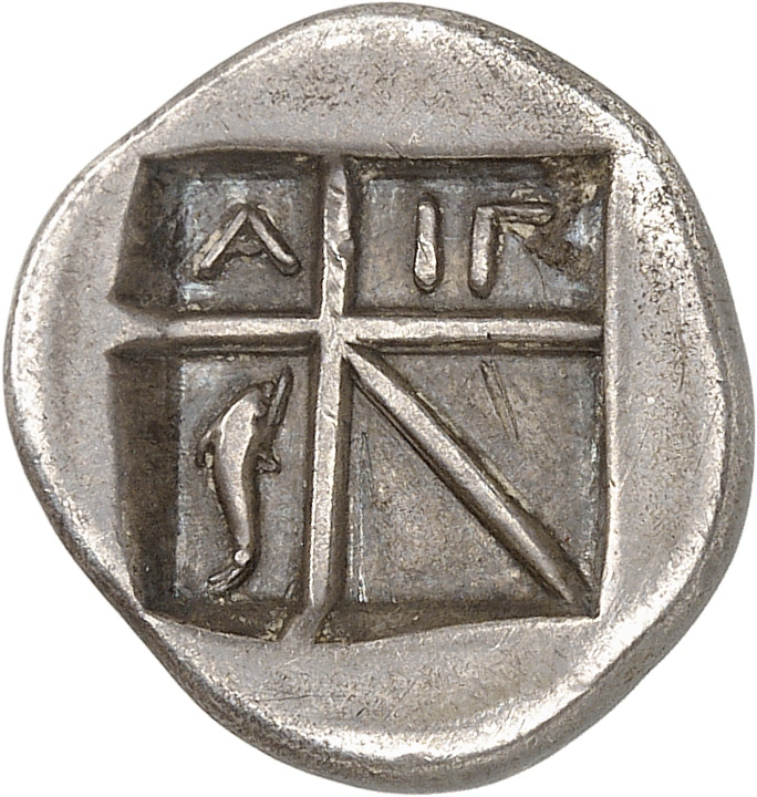 Rv. A - IΓ. Carré creux, A au 1, IΓ au 2, un dauphin au 3 et le 4 avec une barre oblique.