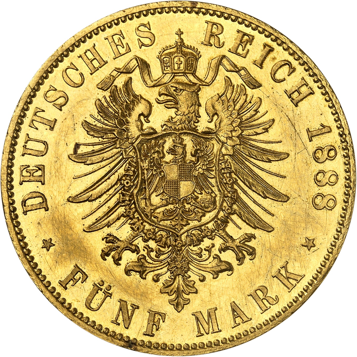 Rv. DEUTSCHES REICH (date) / * FÜNF MARK *. Aigle éployée et couronnée, avec écu en cœur.