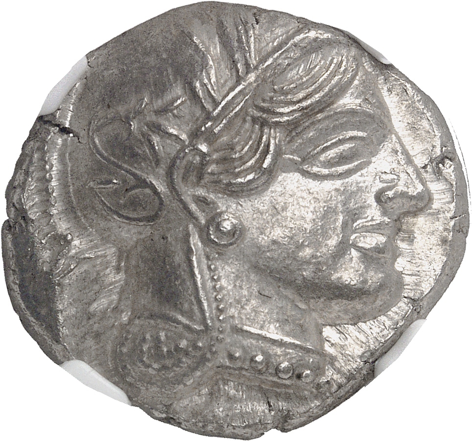 Av. Tête d'Athéna à droite, coiffée du casque à aigrette ; elle porte des boucles d'oreilles rondes centrées d'un point.