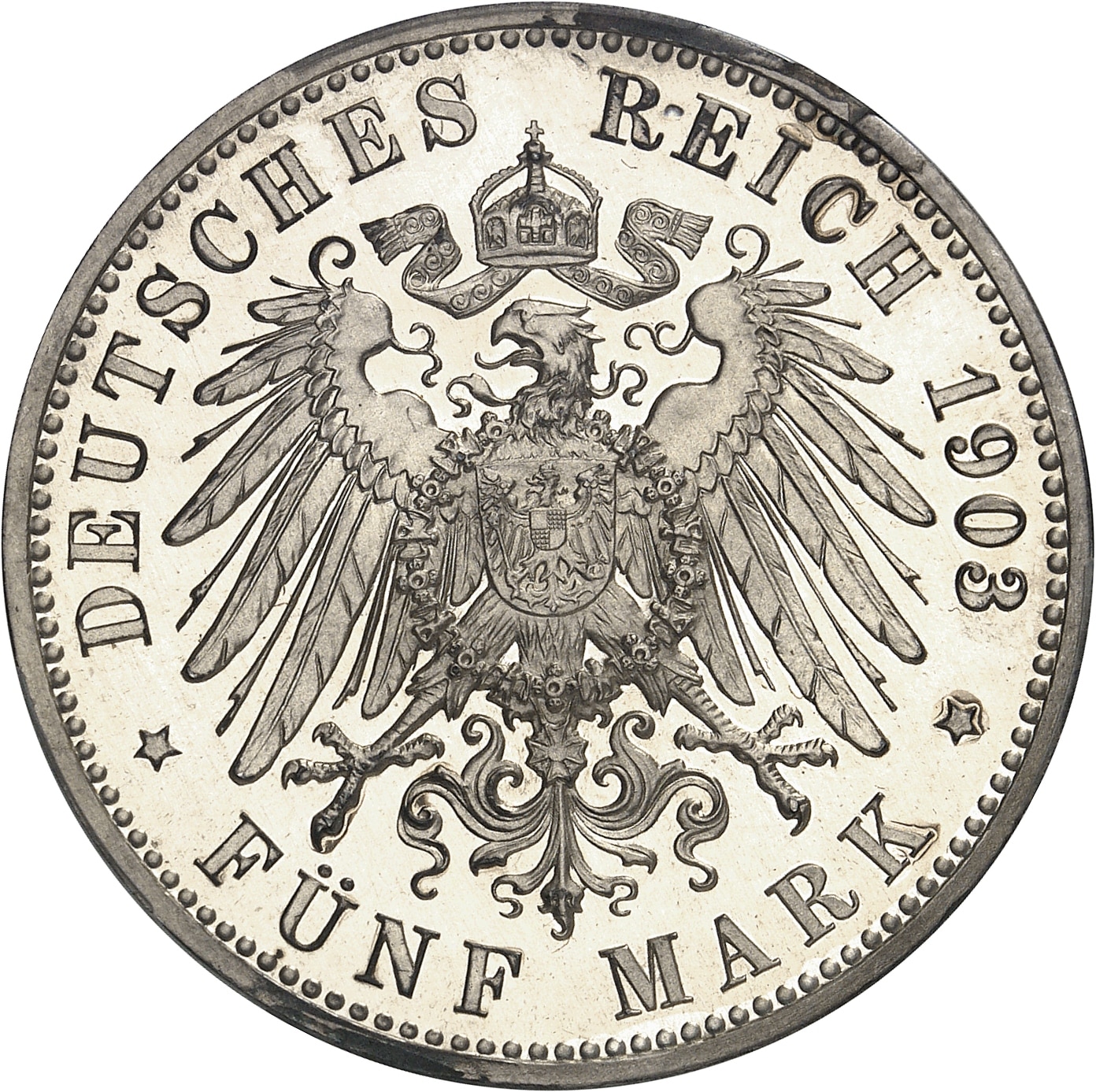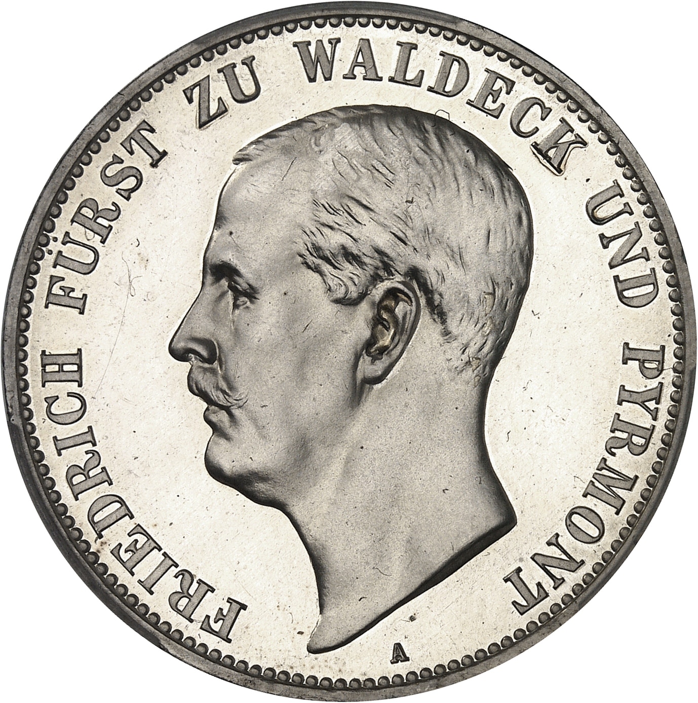 - GERMANY Waldeck-Pyrmont, Frédéric (1893-1918). 5 mark, Flan bruni (PROOF) 1903, A, Berlin.