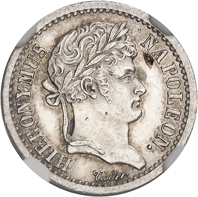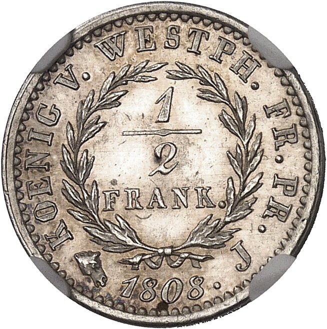 - GERMANY Westphalie, Jérôme Napoléon (1807-1813). 1/2 frank, Flan bruni (PROOF) 1808, J, Paris.
