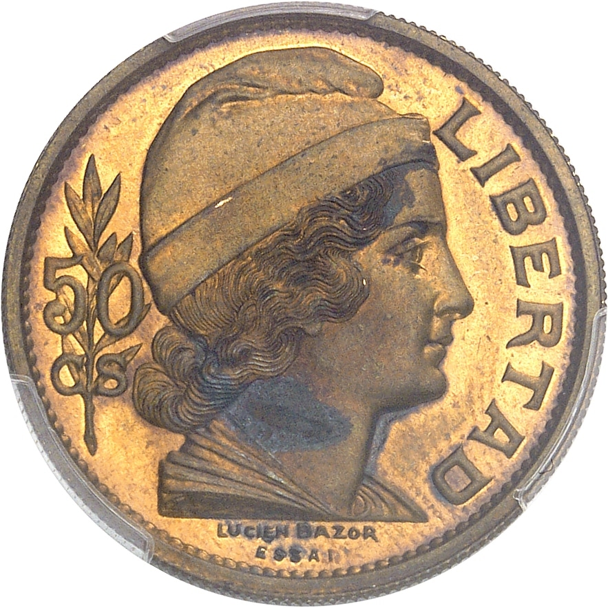 - ARGENTINA République. Essai de 50 centavos par Lucien Bazor, Frappe spéciale (SP) 1940, Paris.