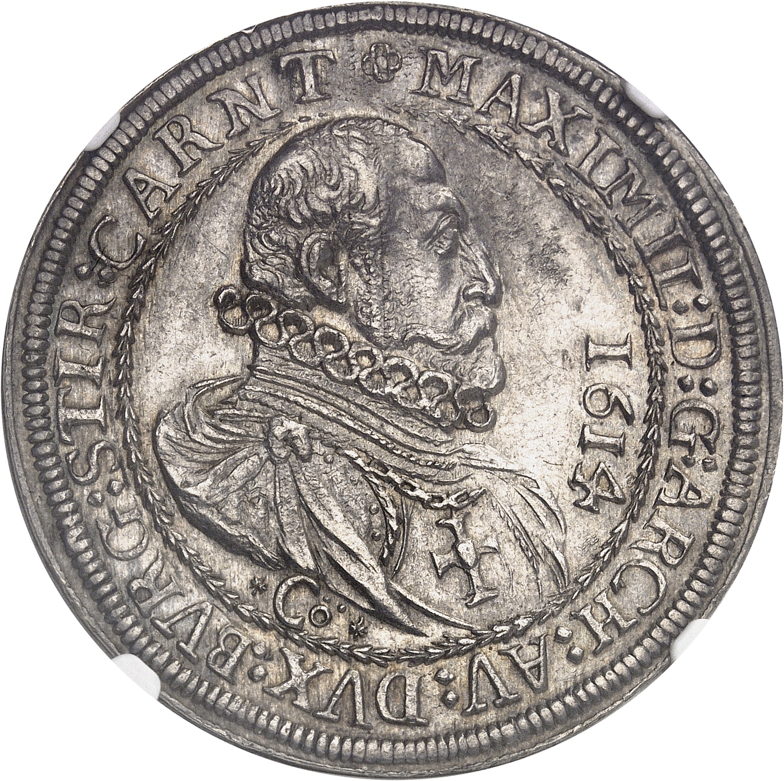 Av. * MAXIMIL: D: G: ARCH: AV: DVX: BVRG: STIR: CARNT. Buste drapé et cuirassé, avec fraise et croix pectorale, à droite ; devant : (date) ; Au-dessous, signature *Cö*.