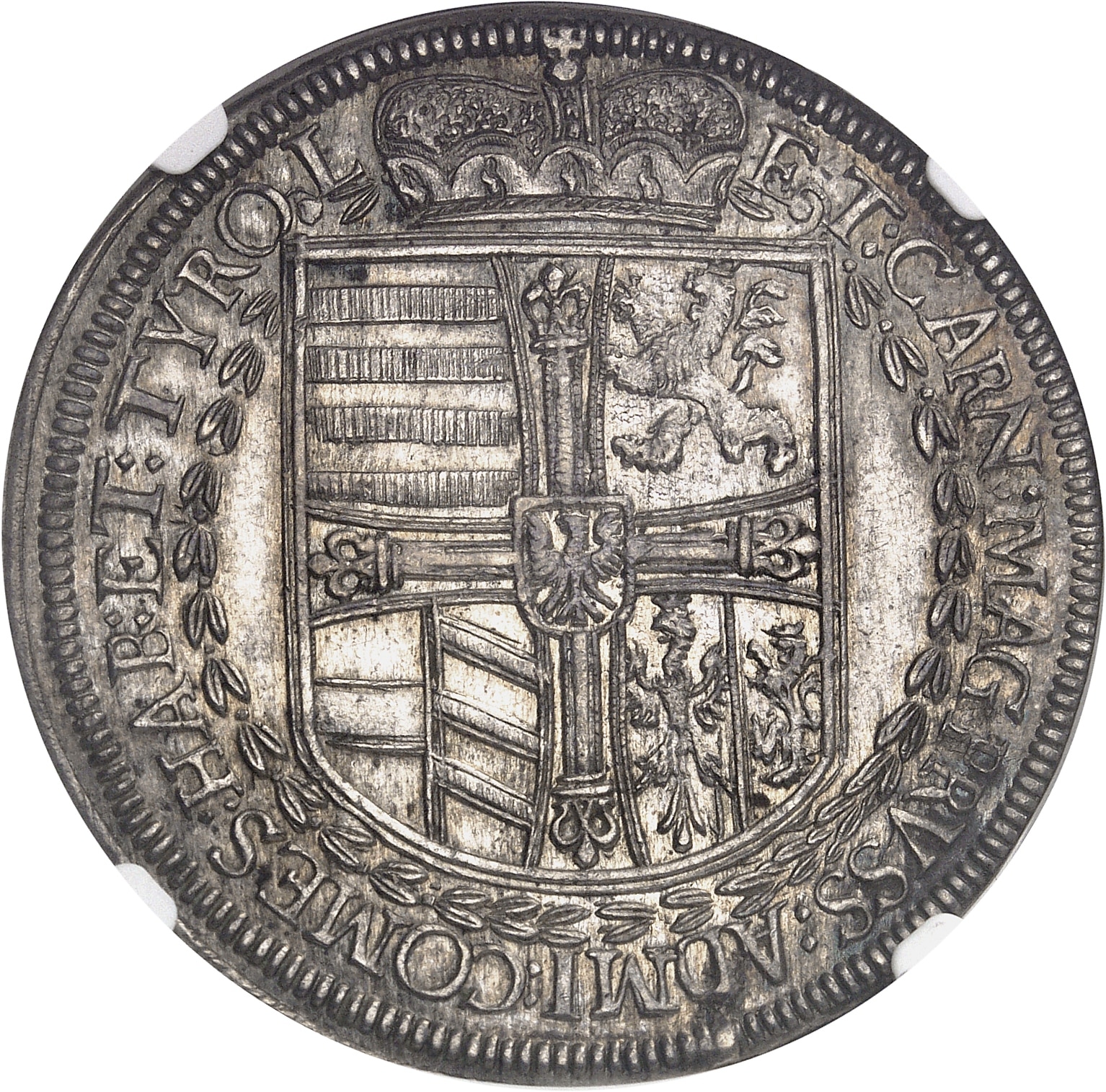 Rv. ET: CARN: MAG PRVSS: ADMI: COMES:HAB: ET: TYROL. Écu surmonté d’un bonnet d’Électeur et entouré d’une couronne de laurier.