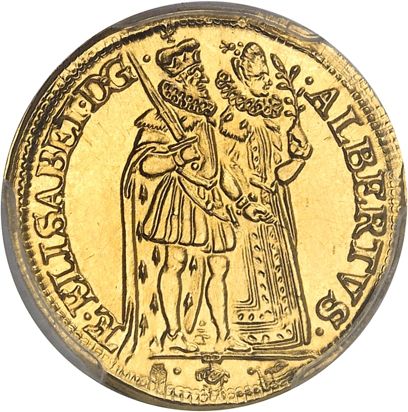 PCGS MS67 (50536305). Refrappe de la fin du XXe siècle par la Monnaie de Paris du 2/3 de souverain d’Albert et Isabelle pour le Brabant, au titre de 920/1000 (poinçon corne 1 à l’avers). Très haut grade. Fleur de coin.