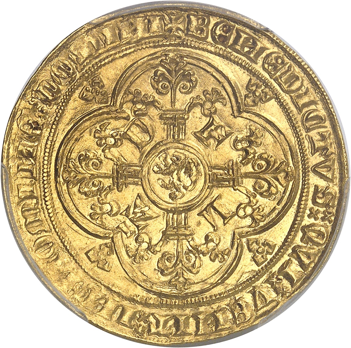 Rv. + BENEDICTVSx QVIx VENITx INx NOMINEx DOMINI. Croix feuillue avec un lion en cœur, cantonnée de F, L, A et D, dans un quadrilobe cantonné de quatre trèfles.