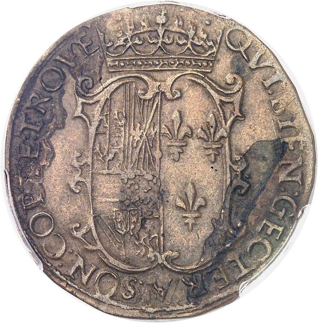 Rv. QVI: BIEN: GECTERA: SON: COPTE: TROVE. Écu festonné, parti d’Espagne et de France, couronné.