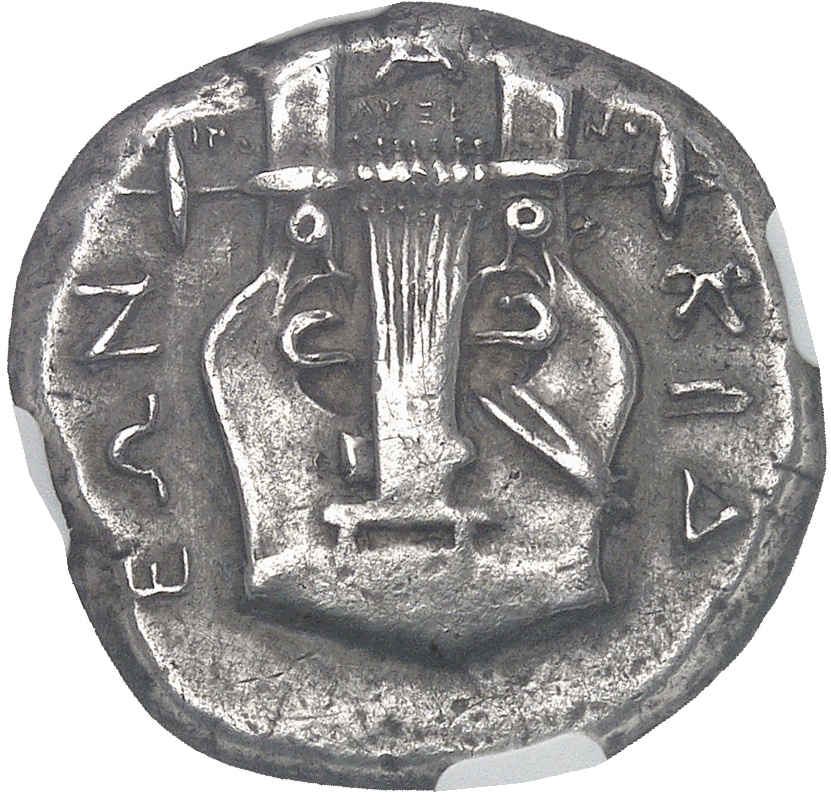 Rv. [X]-A-[L]-KIΔ-EΩN / [ΕΠ]-Ι ΓΟ-ΛΥΞΕ-ΝΟ[Σ]. Cithare.
