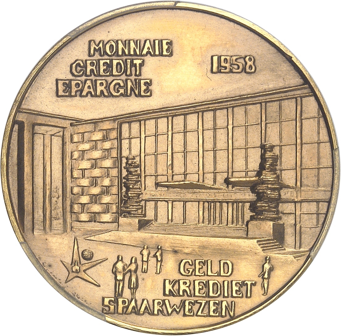 Rv. MONNAIE / CREDIT / EPARGNE - GELD / KREDIET / SPAARWEZEN. Vue intérieure de l’Exposition de 1958, avec quelques personnages, un globe et une étoile.
