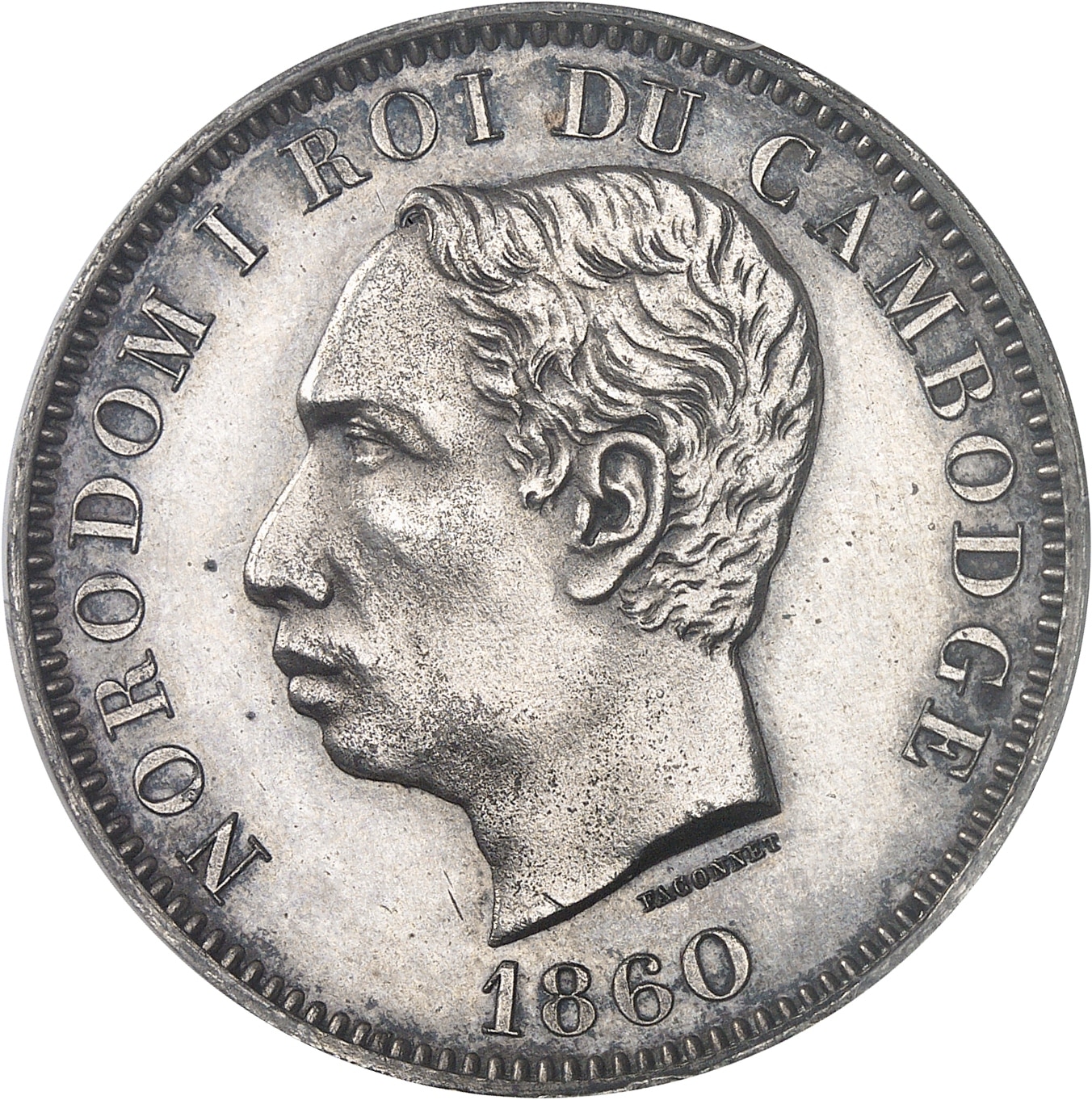 Av. NORODOM I ROI DU CAMBODGE. Tête nue à gauche, au-dessous signature FACONNET et (date).