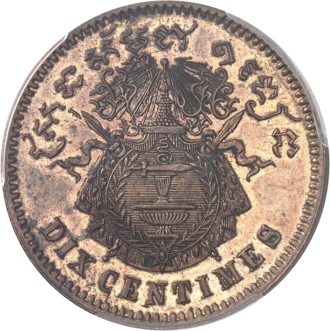 Rv. DIX CENTIMES. Légende et armoiries du Cambodge.