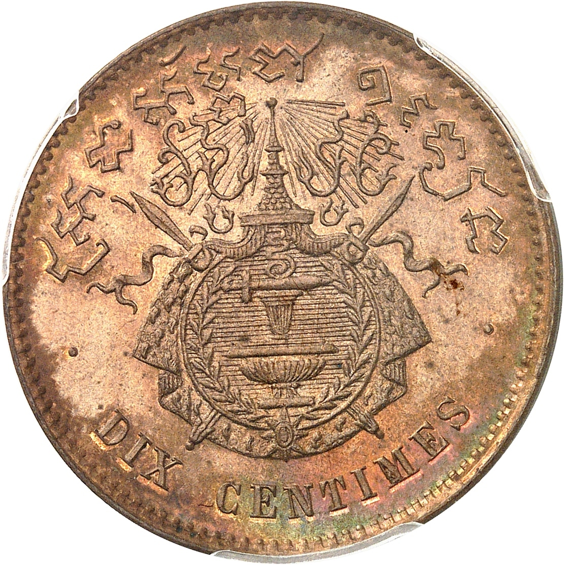 Rv. DIX CENTIMES. Légende et armoiries du Cambodge.