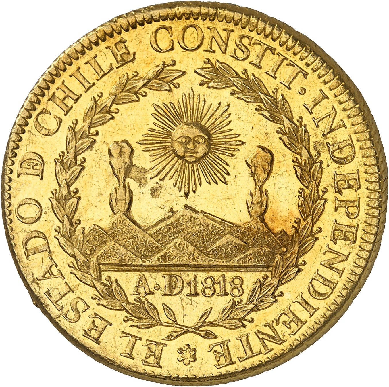 Av. (à 6 h) * EL ESTADO [DE] CHILE CONSTIT. INDEPENDIENTE. Dans une couronne formée de deux branches de laurier, un soleil rayonnant au-dessus de montagnes et de volcans ; au-dessous, A. [DE] 1818.