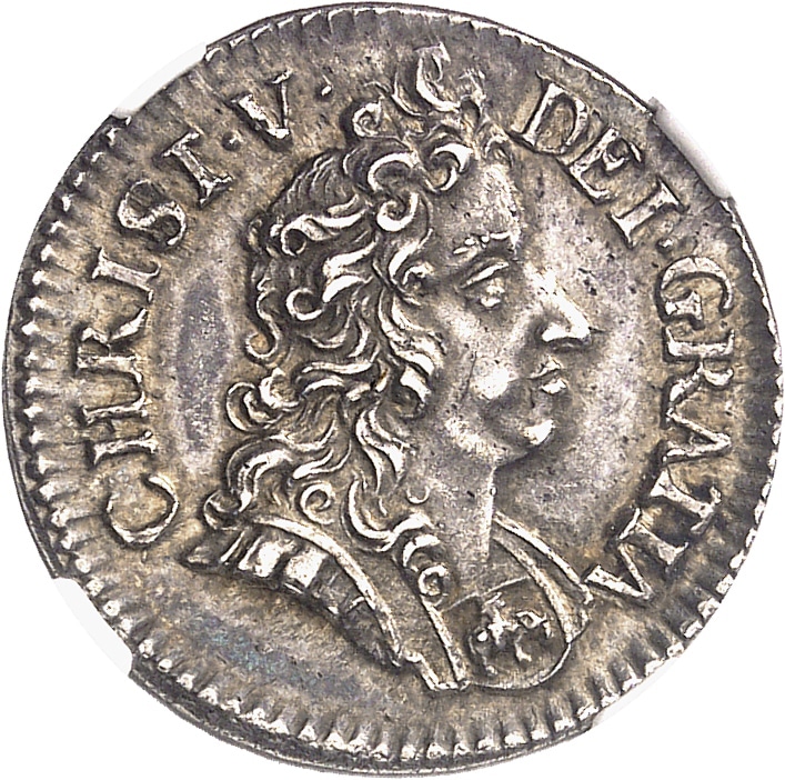 Av. CHRIST. V. - DEI. GRATIA. Buste cuirassé à droite, avec l’ordre de l’Éléphant.