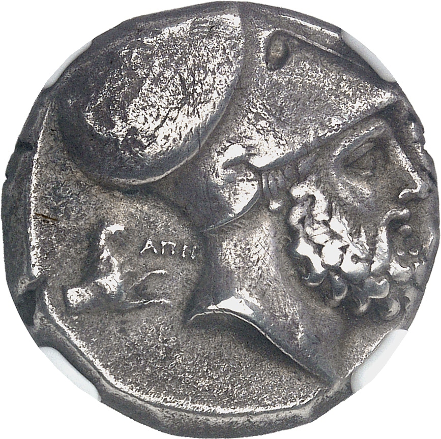 Av. ΑΠΗ. Tête barbue et casquée de Leucippe à droite, coiffée du casque corinthien orné d’un quadrige conduit par une victoire ; protomé de lion derrière la nuque.