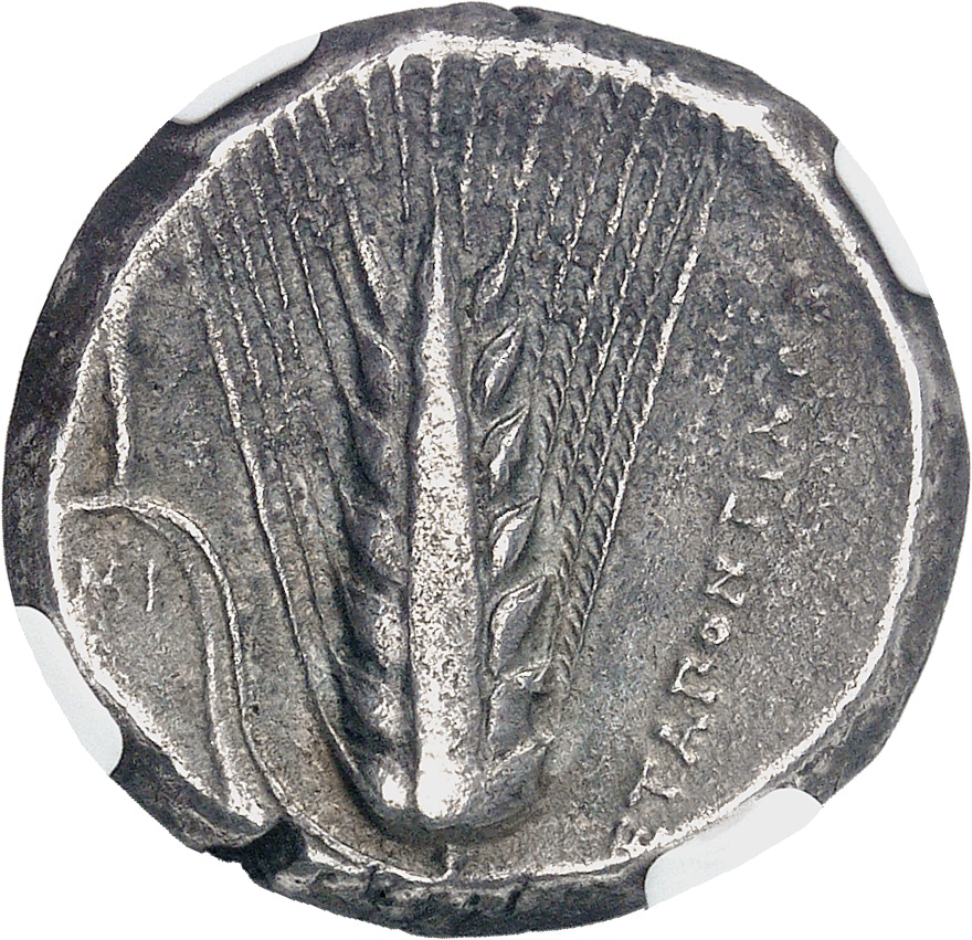Rv. [Μ]ΕΤΑΠΟΝΤΙΝΩΝ. Épi de blé sur sa tige avec feuille à gauche ; à gauche, [A]MI sous la feuille.