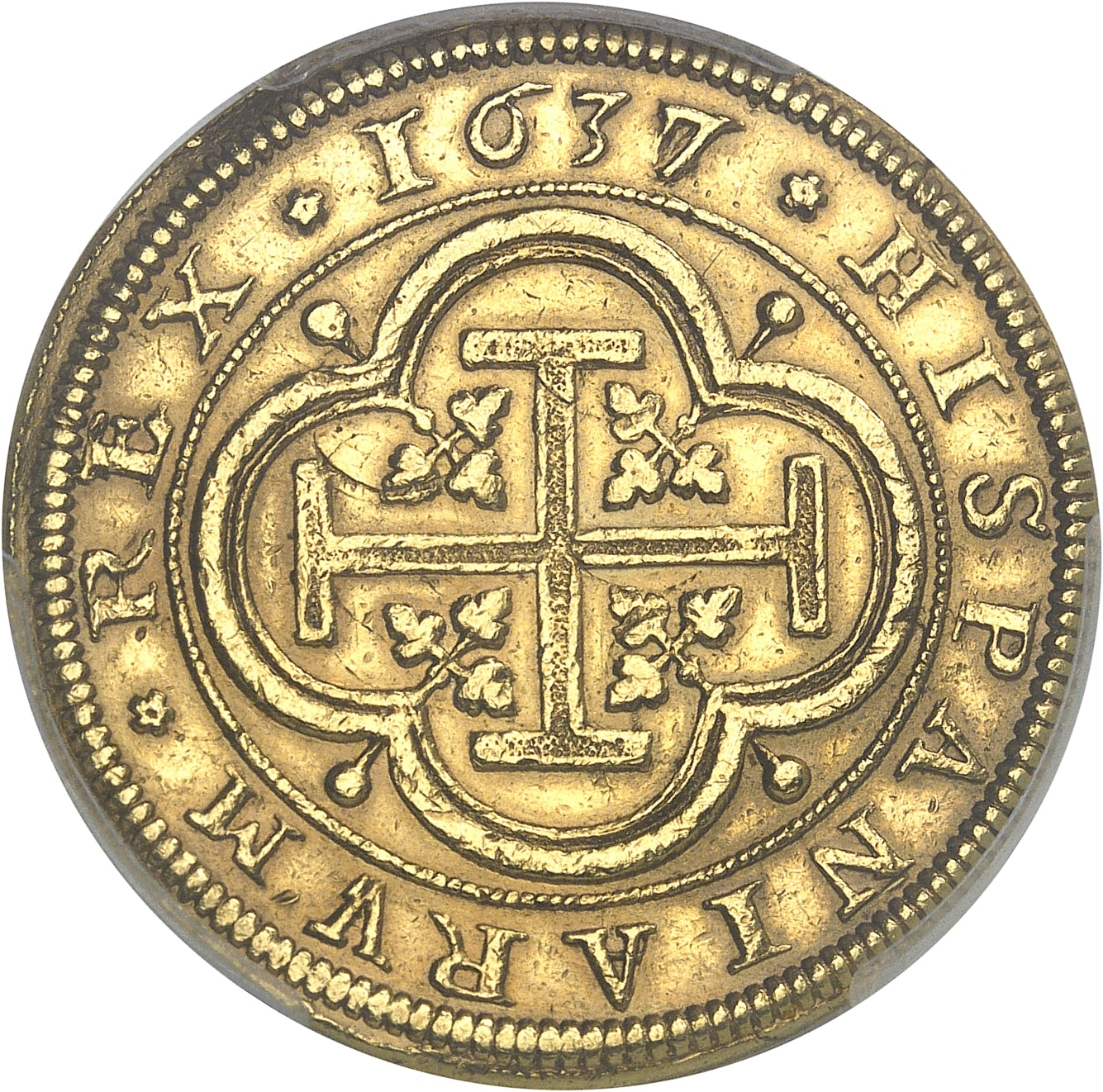 Rv. *HISPANIARVM* REX* (date). Croix pattée cantonnée de quatre fleurs de lis stylisées, dans un quadrilobe cantonné de quatre besants.