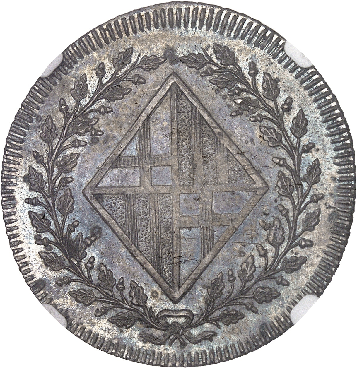 Av. Couronne formée de deux branches de chêne avec au centre les armoiries de Barcelone (écartelé d'argent à la croix de gueules et d'or à quatre pals de gueules).